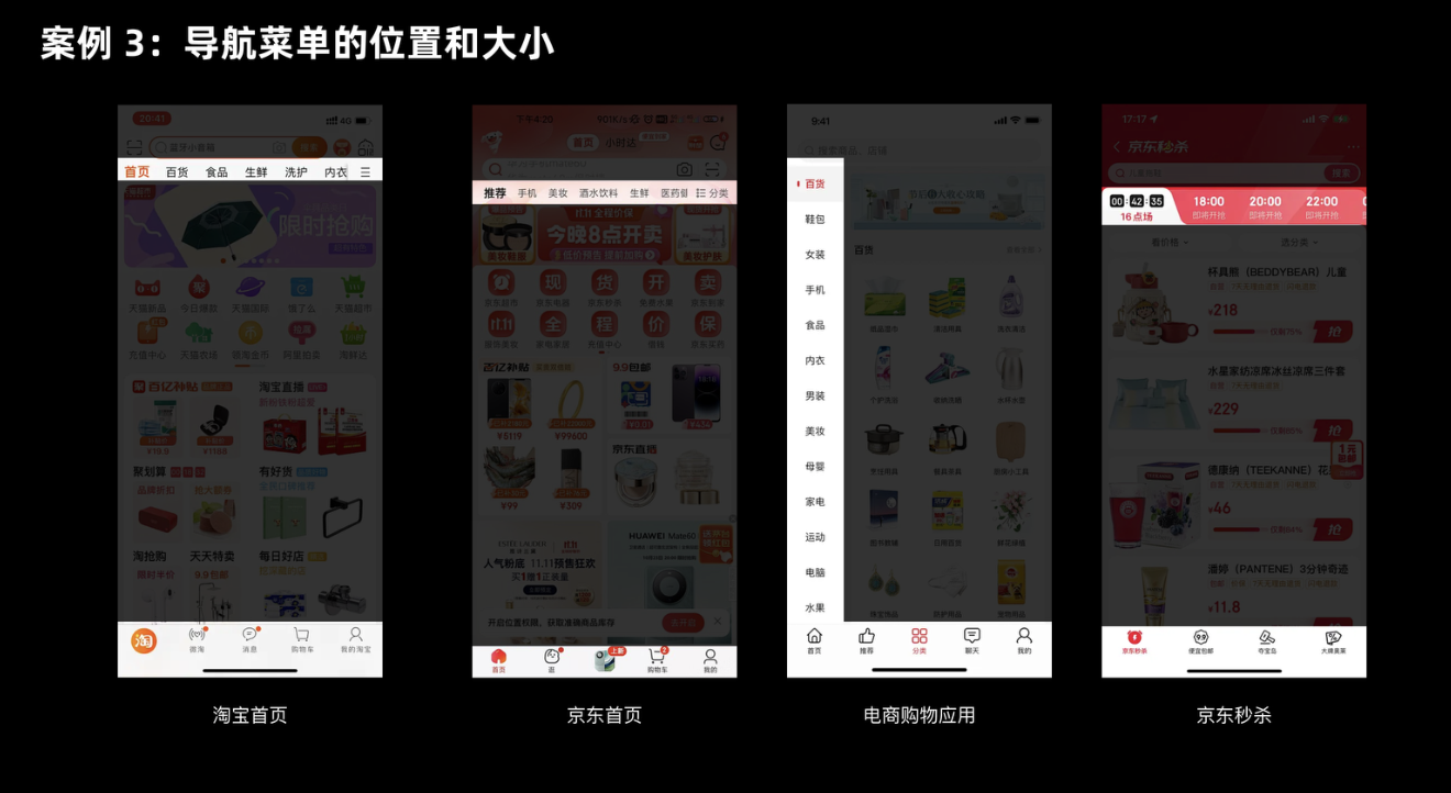 導(dǎo)航是用戶高頻操作的模塊,它的位置和大小直接影響瀏覽效率。菲茲定律在這里的應(yīng)用重點是 “縮短距離”—— 把導(dǎo)航放在用戶手指或視線最容易到達(dá)的地方。