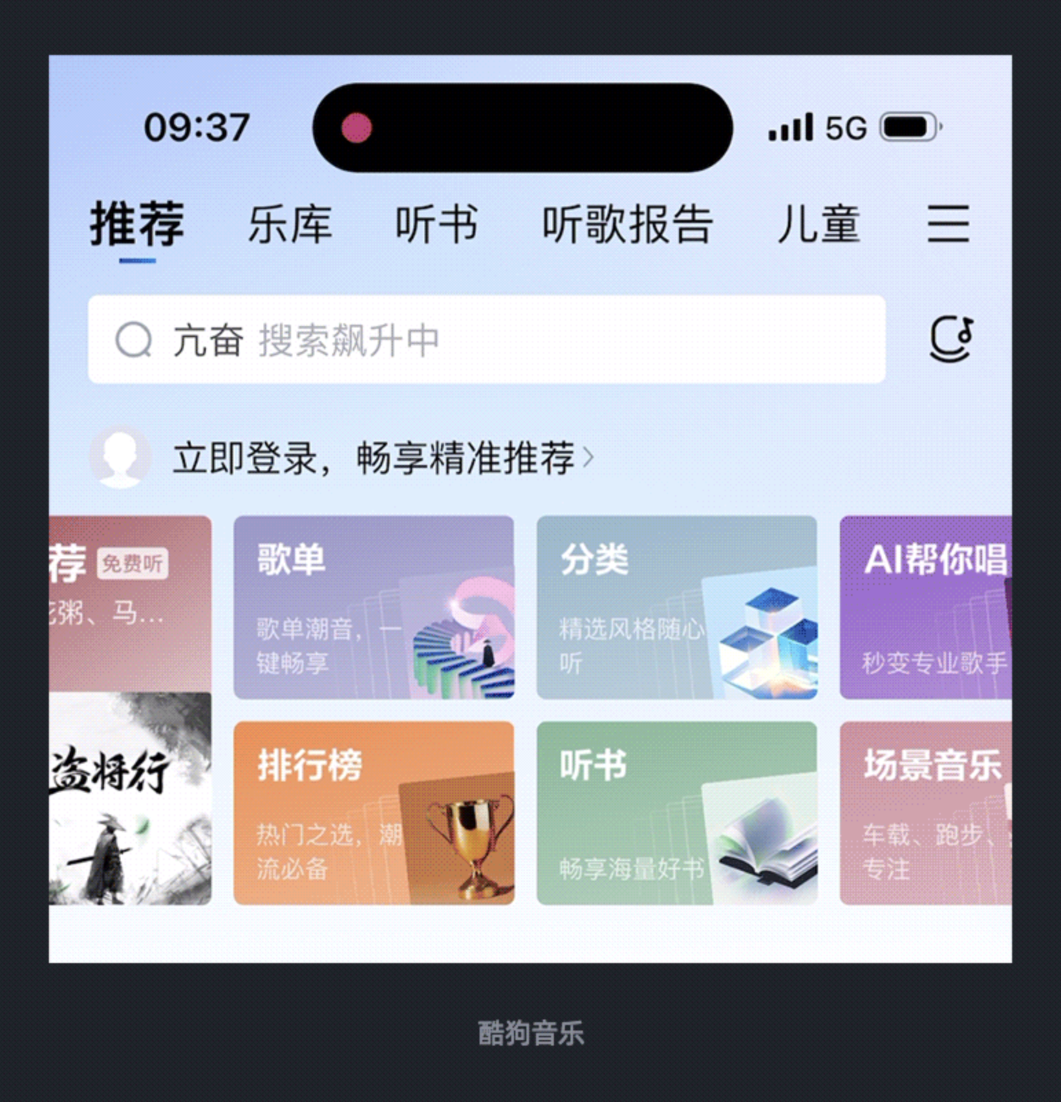 瓷片區是 App 承載多元功能的核心模塊,而自適應布局則讓其兼顧實用性與擴展性。酷狗音樂未登錄狀態下的首頁推薦板塊,采用了動態自適應瓷片區設計:滑動頁面時,模塊會根據內容多少自動調整大小與排列方式,隱藏非核心信息以提升空間利用率。